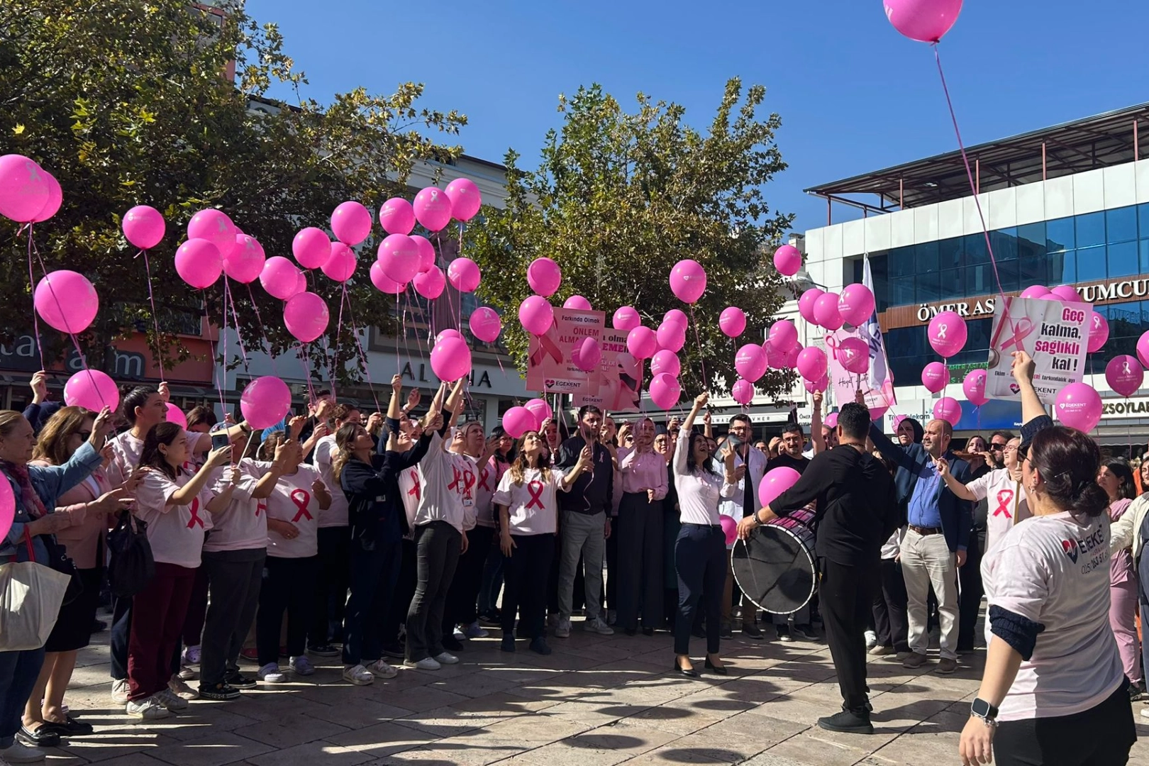 1-31 Ekim Meme Kanseri Farkındalık Ayı dolayısıyla Egekent Hastanesi anlamlı ve dikkat çekici bir etkinliğe imza attı. Pembe kurdele takan hastane personeli, farkındalık oluşturmak amacıyla hastane önünden ellerindeki pembe balonlarla Bayramyeri Meydanı’na kadar davul ve zurna eşliğinde yürüdü.
