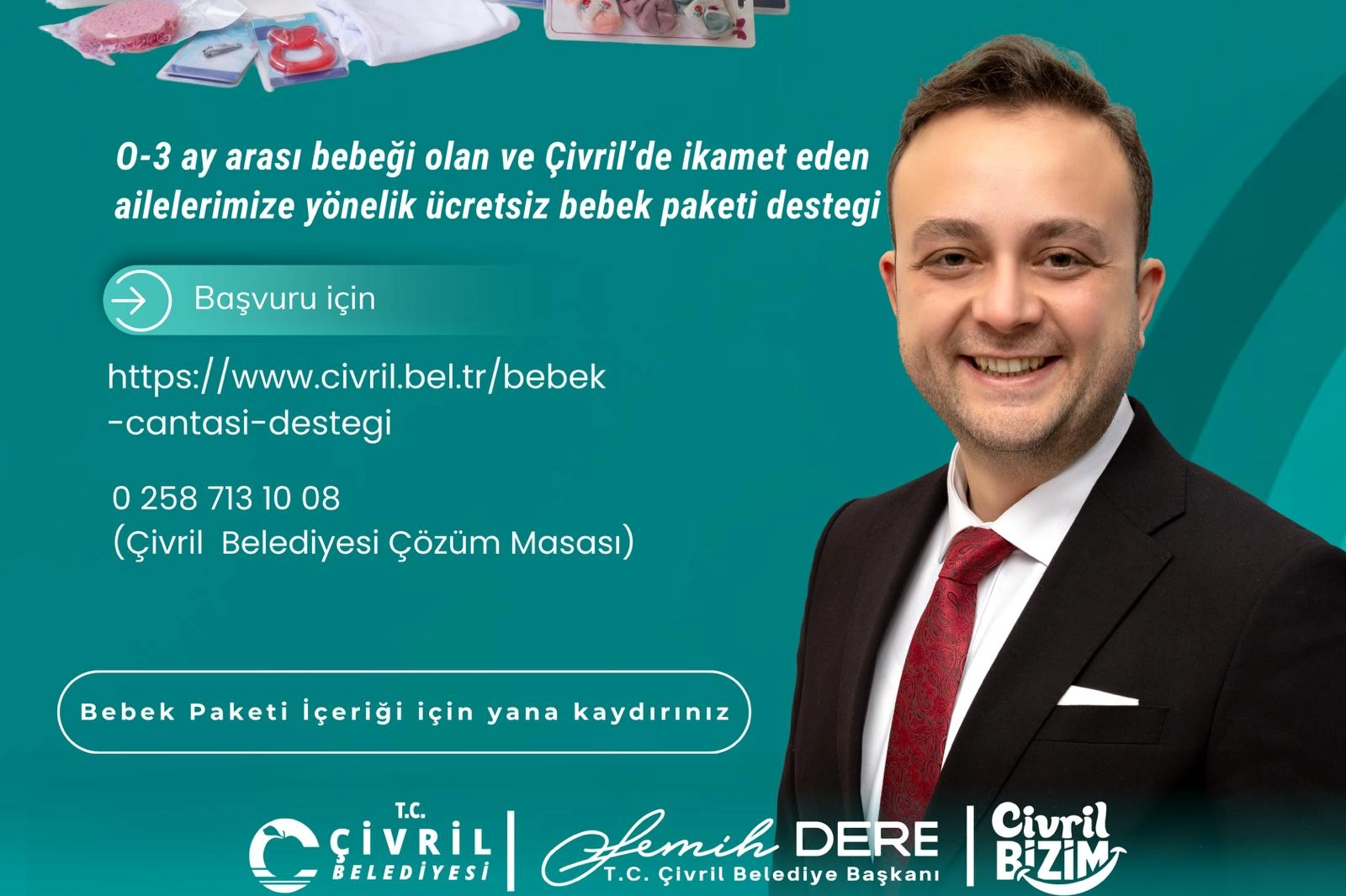 “İlçemizde bir ilki hayata geçirmenin mutluluğunu ve heyecanını yaşıyoruz. Çivril Belediyesi olarak, yeni doğan bebeklerimizin ailelerine bir nebze de olsa destek olabilmek amacıyla ‘Hoş Geldin Bebek’ projemizi başlatıyoruz. Bu özel yolculuğun ilk adımında, 0–3 aylık bebeği olan tüm ailelerimize destek paketlerimizi ulaştırıyoruz. Dünyaya gözlerini açan tüm bebeklerimize sağlıklı, mutlu ve uzun bir ömür diliyor, paketlerimizin ailelerimize hayırlı olmasını temenni ediyorum.”