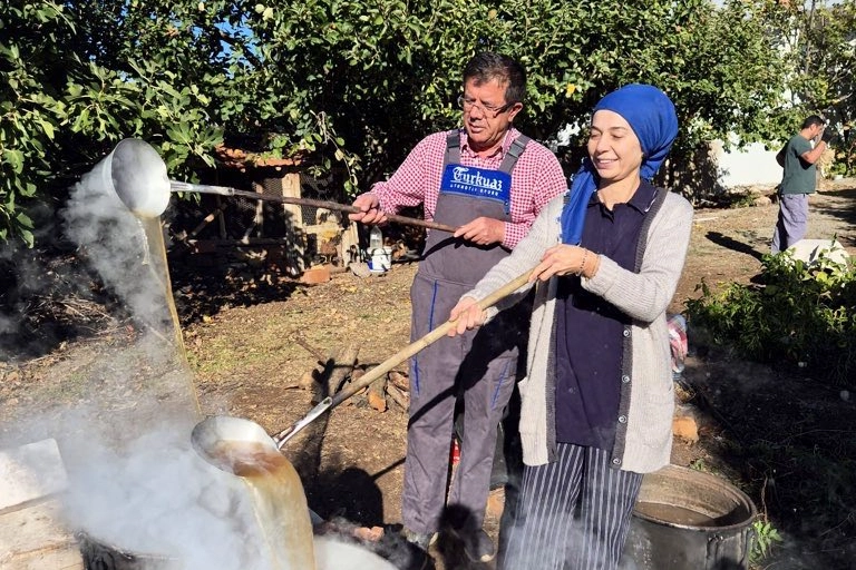 Aileye ait bağlardan toplanan üzümlerin sıkılmasının ardından tulumunu giyen Zeybekci, eline kepçeyi alarak kaynayan pekmez kazanlarını karıştırdı. Her yıl ailesiyle birlikte baba ocağını ziyaret eden Zeybekci, bu geleneği yaşatmanın kendisi için büyük bir mutluluk olduğunu ifade etti.