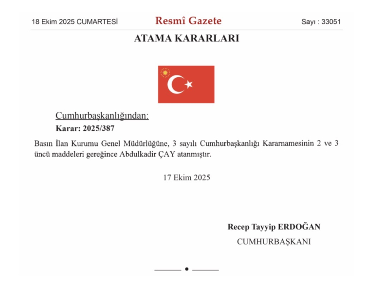 Cumhurbaşkanı Recep Tayyip Erdoğan’ın imzasıyla Resmî Gazete’de yayımlanan karara göre Basın İlan Kurumu Genel Müdürü Abdulkadir Çay oldu.